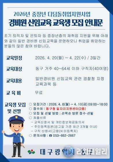 리치데일리 김상현 기자 | 대구 동구청은 오는 6일부터 10일까지 ‘일반경비원 신임교육’ 참가자 40명을 모집한다.