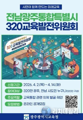 리치데일리 김상현 기자 | 광주시교육청은 광주・전남 교육행정 통합 시대를 대비하고 통합 이후 지역 교육의 미래 청사진을 그리기 위한 ‘전남광주통합특별시 320교육발전위원회’에 참여할 시도민 위원 320명을 공개 모집한다.