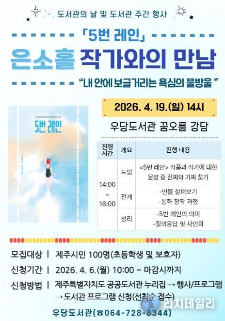 리치데일리 김상현 기자 | 제주시 우당도서관은 어린이들에게 독서의 즐거움과 창작의 세계를 전하기 위해 ‘5번 레인’의 저자 은소홀 동화 작가와의 만남을 개최한다.