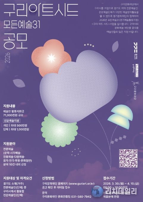 리치데일리 김상현 기자 | (재)구리문화재단은 구리 시민의 문화 향유 기회를 확대하고 지역 예술 생태계를 활성화하기 위한 2026년 예술인지원 사업 ‘구리아트시드(모든 예술 31)’ 공모를 오는 4월 10일 오후 6시까지 접수한다고 밝혔다.