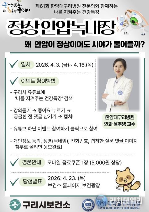 시민들은 4월 3일부터 16일까지 구리비전 채널을 통해 강의를 시청한 후 궁금한 사항을 댓글로 남기면, 우수질문 3건을 선정해 한양대구리병원 안과 윤주영 교수가 직접 답변할 예정이다. 또한 참여자 중 17명을 무작위로 선정해 총 20명에게 모바일 쿠폰을 증정한다.