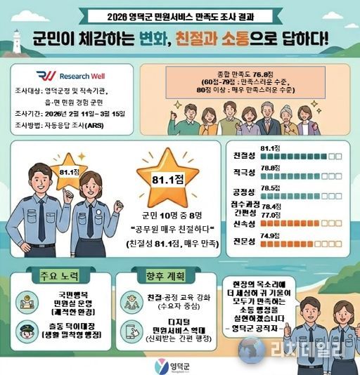 리치데일리 김상현 기자 | 영덕군이 실시한 ‘2026년 민원 서비스 만족도 설문조사’ 결과 종합 만족도 76.8점을 기록하며 군민 중심의 민원 행정이 눈에 띄는 성과를 거두고 있는 것으로 나타났다.