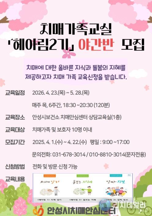 리치데일리 김상현 기자 | 안성시보건소 치매안심센터가 직장이나 생업으로 낮시간대 교육받기 어려운 치매환자 가족을 위하여 오는 23일부터 가족교실 야간반을 운영한다.