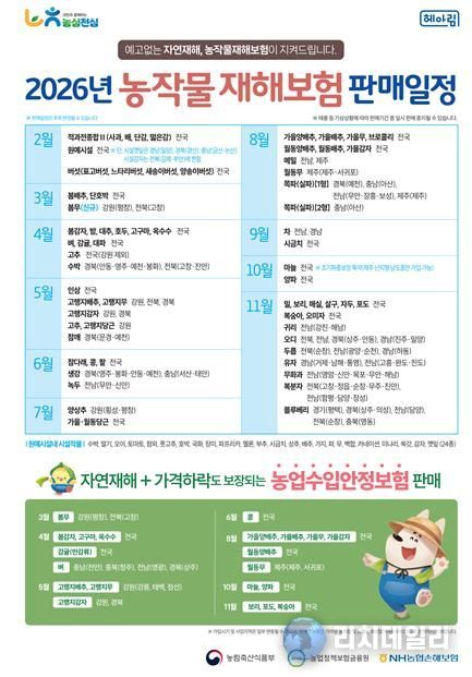 보험의 가입 기간 및 보장 내용은 품목별·유형별로 차이가 있으므로, 가입을 희망하는 농업인은 주소지 지역농협을 방문해 상담 후 가입해야 한다.