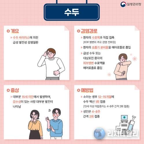 수두와 유행성이하선염은 환자가 기침할 때 나오는 침방울 등 호흡기 분비물을 통해 전파되는 대표적인 감염병이다.