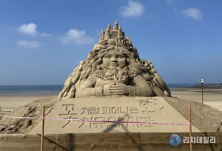 리치데일리 김상현 기자 | 태안 안면도 꽃지해수욕장에 초대형 모래조각상이 등장해 관람객의 발길을 끌고 있다