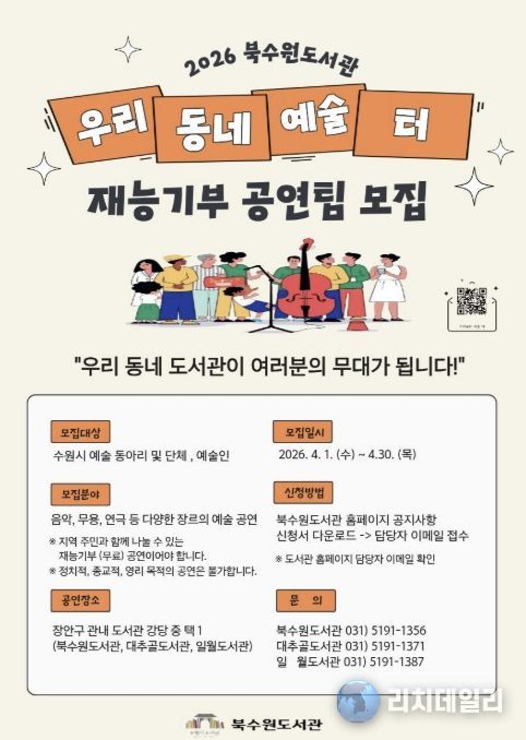 리치데일리 김상현 기자 | 북수원·대추골·일월도서관은 시민 참여 문화공연 ‘우리동네 예술 터’에 참여할 재능기부 공연팀을 4월 30일까지 모집한다.