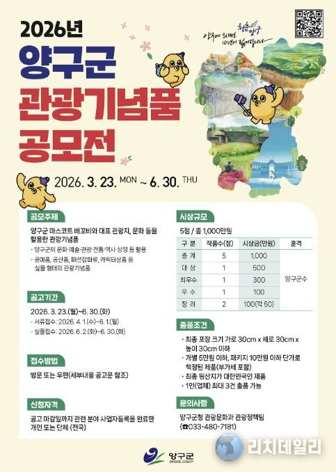 리치데일리 김상현 기자 | 양구군은 지역을 대표할 수 있는 특색 있는 관광기념품을 발굴·육성하기 위해 ‘2026년 양구군 관광기념품 공모전’을 개최한다.