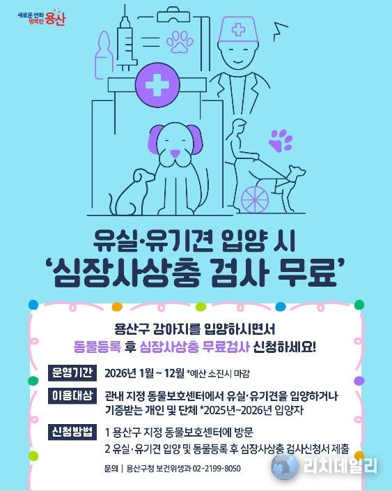 지원 대상은 2025~2026년 중 용산구 관내 지정 동물보호센터에서 유실·유기견을 입양하거나 기증받는 개인 및 단체다. 동물보호센터에 검사신청서를 제출하면 심장사상충 검사를 1회 무료로 받을 수 있다. 구가 검사비 전액을 부담하며, 사업은 예산 소진 시까지 진행된다.