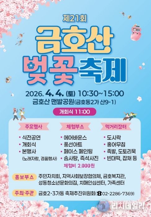 리치데일리 김상현 기자 | 서울 성동구 금호2-3가동은 오는 4월 4일 금호산 맨발공원에서 ‘금호산 벚꽃축제’를 개최한다고 밝혔다.