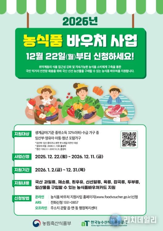 시 관계자는 “농식품 바우처는 취약계층의 건강한 식탁을 지원하고 우리 농가 소득에도 기여하는 사업인 만큼, 대상자 분들은 기간 내 꼭 신청하시고, 주변에서도 수혜 대상이 누락되지 않도록 따뜻한 관심과 홍보를 부탁드린다.”고 말했다.