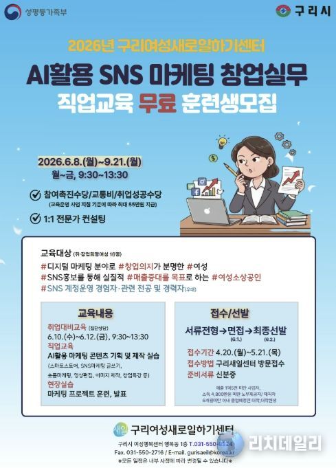 리치데일리 김상현 기자 | 구리시는 구리새일센터에서 여성들의 디지털 마케팅 역량을 강화하고 성공적인 취·창업을 지원하기 위해 ‘AI 활용 SNS 마케팅 창업 실무’ 직업교육훈련 과정의 교육생을 오는 4월 20일부터 모집한다고 밝혔다.