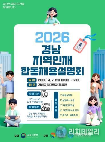 리치데일리 김상현 기자 | 경상국립대학교는 공공기관 및 기업 채용 정보를 제공하여 지역 청년들의 취업 기회를 확대하기 위해 4월 7일 오전 10시부터 오후 5시까지 가좌캠퍼스 체육관(월계관)에서 ‘2026년 경남·울산 지역인재 합동 채용설명회’를 개최한다.
