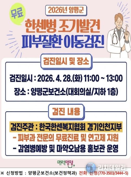 리치데일리 김상현 기자 | 양평군은 오는 28일 양평군보건소 지하 1층 대회의실에서 군민을 대상으로 ‘한센병 조기 발견을 위한 피부질환 이동검진’을 실시한다.
