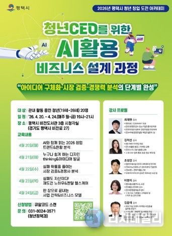 참가 대상은 평택시 관내에서 창업에 관심이 있는 만 19세부터 39세까지의 청년이며, 신청 기간은 4월 2일부터 17일까지 안내 이미지의 정보무늬(QR코드)를 통해 접수할 수 있다. 이번 교육 강좌에 대한 자세한 문의는 평택시청 청년정책과(031-8024-3571)로 하면 된다.