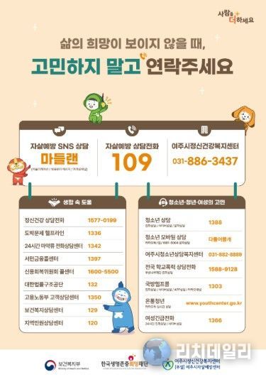 한편, 여주시민은 우울이나 불안 등으로 전문가의 도움이 필요한 경우 자살예방상담전화(109), 정신건강상담전화, 자살예방SNS상담 ‘마들랜’, 여주시정신건강복지센터(부설)자살예방센터를 통해 상담을 받을 수 있다.