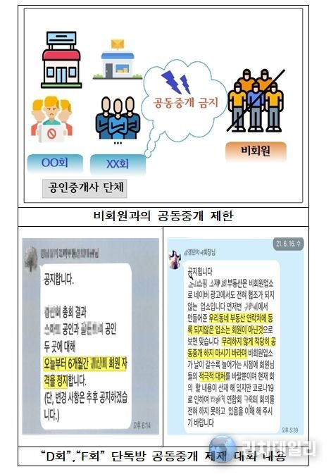 이 단톡방에“공멸하지 않으려면 비회원을 축소·위축시켜야 합니다.”, “D회 총회 결과 공인중개사와 ◇◇공인중개사 2곳에 대해 6개월간 회원자격을 정지합니다.”라는 등 비회원과 공동중개한 회원들을 제재했다.