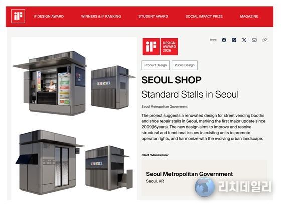 서울시는 보도상 영업시설물 서울형 표준디자인이 세계 3대 디자인 어워드로 꼽히는 독일 ‘iF 디자인 어워드(iF DESIGN AWARD) 2026’ 제품·공공 디자인 부문에서 본상을 수상했다고 밝혔다.