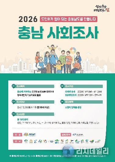이번 조사 결과는 분석을 거쳐 오는 12월에 최종 공표되며, 향후 ‘2026년 충청남도 사회지표 보고서’로 발간돼 각종 지역 발전 정책 수립의 핵심 데이터로 활용될 예정이다.