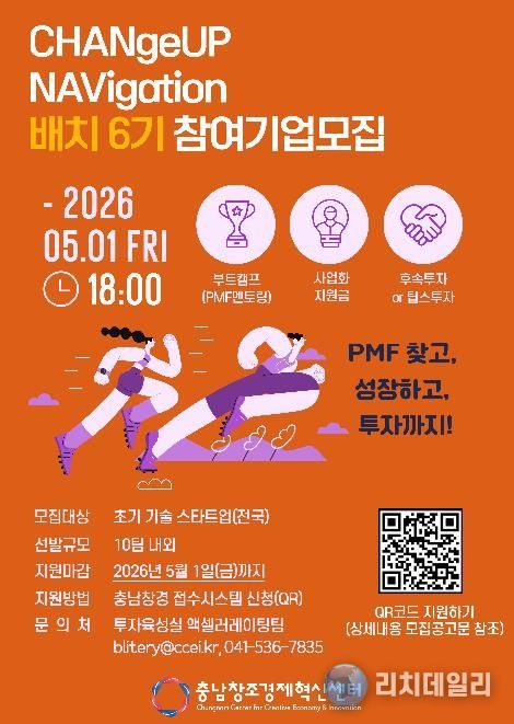 리치데일리 김상현 기자 | (재)충남창조경제혁신센터가 혁신 기술을 보유한 유망 스타트업의 비즈니스 스케일업을 지원하기 위해 ‘2026 CHANGeUP NAVIgation’ 배치(Batch) 6기 프로그램의 참가 희망 기업을 모집한다고 밝혔다.