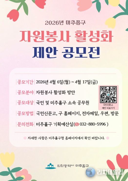 리치데일리 김상현 기자 | 인천 미추홀구는 지역의 사회문제를 해결하고 자원봉사 문화를 확산하기 위해 ‘2026년 자원봉사 활성화 제안 공모전’을 개최한다고 6일 밝혔다.
