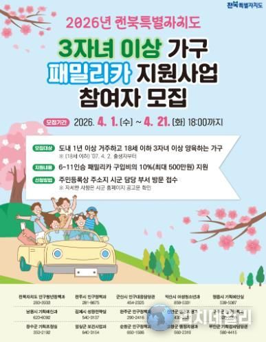 리치데일리 김상현 기자 | 임실군은 3자녀 이상 다자녀 가구의 가족 동반 이동 여건 개선 및 안정적인 양육 환경을 조성하기 위해 ‘3자녀 이상 가구 패밀리카 지원사업’신청을 접수한다고 1일 밝혔다.