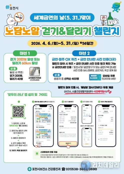 리치데일리 김상현 기자 | 포천시보건소는 세계 금연의 날(5월 31일)을 맞아 ‘노담노알(금연·절주) 걷기·달리기 챌린지’를 운영한다.