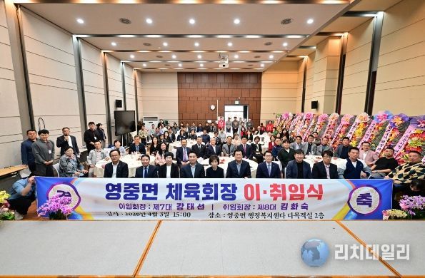 리치데일리 김상현 기자 | 포천시 영중면 행정복지센터는 지난 3일 영중면 체육회장 이·취임식을 열고, 제7대 강태선 회장의 이임과 제8대 김화숙 회장의 취임을 축하했다.