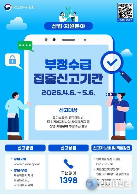 리치데일리 김상현 기자 | 국민권익위원회는 6일부터 5월 6일까지 한 달간 유가보조금, 연구개발비, 창업지원금 등 산업·자원 분야 정부지원금 부정수급 집중신고기간을 운영한다고 밝혔다.