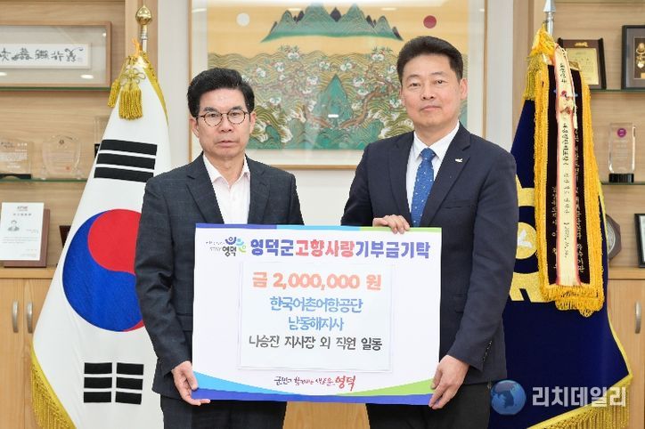 리치데일리 김상현 기자 | 한국어촌어항공단 남동해지사의 나승진 지사장이 지난 3일 영덕군을 찾아 지역사회와의 상생과 나눔 문화 확산을 위해 고향사랑기부금 200만 원을 기탁했다.