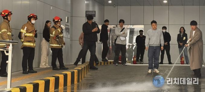 훈련은 화재 발생 시 행동 요령 교육을 시작으로 ▲연기 발생 상황을 가정한 대피 훈련 ▲교육용 소화기 사용 실습 ▲옥내 소화전 살수 실습 순으로 진행됐으며, 참가자들은 실제 화재 상황에 대비한 대응 능력을 체득했다.