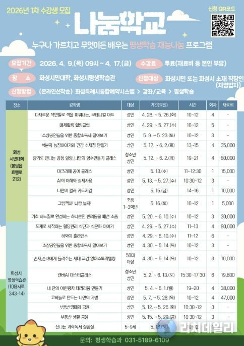 리치데일리 김상현 기자 | 화성특례시는 시민 간 지식과 재능을 나누는 평생학습 프로그램 ‘나눔학교’의 2026년 1차 수강생을 오는 4월 9일부터 4월 17일까지 선착순으로 모집한다.