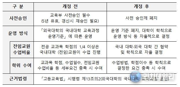 기존에는 국내 대학이 프랜차이즈를 운영하기 위해서 교육부의 사전 승인을 받아야 했으나, 2024년 2월 고등교육법 시행령 개정으로 대학 간 협약만으로도 운영이 가능해졌다. 교육과정의 구성과 수업 운영도 각 대학이 학칙으로 자율적으로 정할 수 있게 되어 현장에서 ‘프랜차이즈’ 운영의 추진력이 높아졌다.