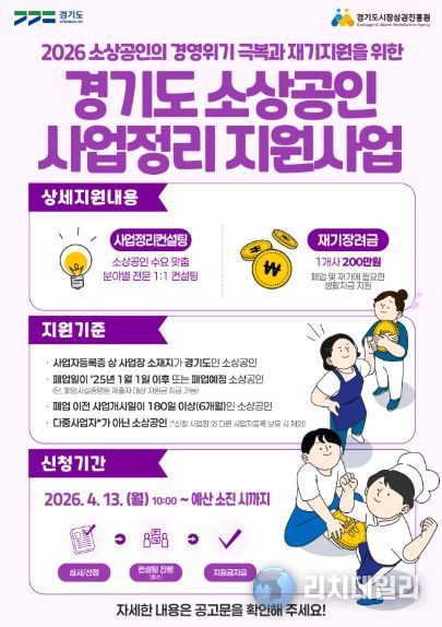 리치데일리 김상현 기자 | 경기도시장상권진흥원은 도내 경영 위기로 폐업했거나 폐업을 앞둔 소상공인들의 안정적인 재기를 돕기 위해 ‘2026년 경기도 소상공인 사업정리 지원사업’을 추진한다고 밝혔다.