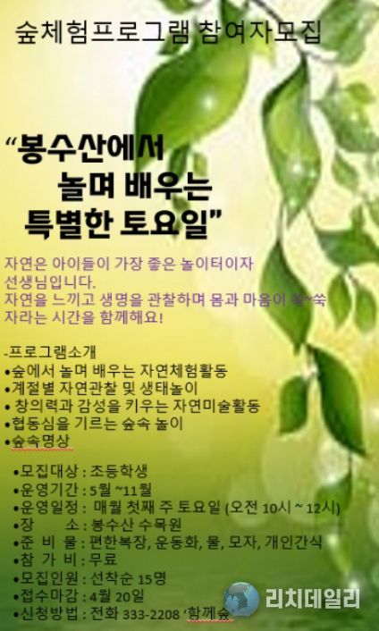 프로그램은 5월부터 11월까지 매월 첫째 주 토요일 오전 10시부터 12시까지 봉수산수목원에서 진행되며, 참가 대상은 초등학생으로 선착순 15명을 모집한다.