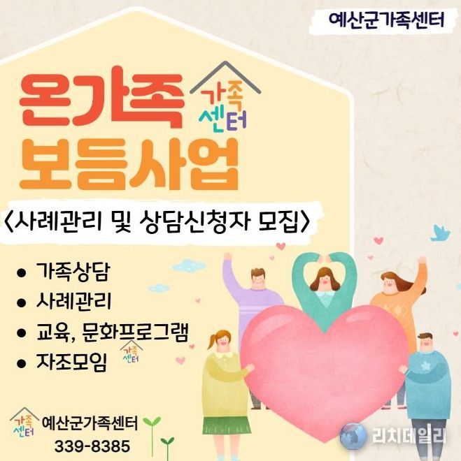 리치데일리 김상현 기자 | 예산군가족센터는 취약가구와 위기가족의 복합적인 문제 해결과 욕구 해소를 위한 통합서비스 제공을 위해 1월부터 ‘온가족보듬사업’을 운영하고 있다.