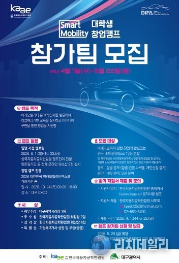 리치데일리 김상현 기자 | 대구광역시는 자동차 산업 원로들의 풍부한 현장 경험과 청년들의 혁신적인 아이디어를 결합해 미래모빌리티 핵심 인재를 육성하는 ‘2026 스마트 모빌리티 창업캠프’ 참가팀을 모집한다.