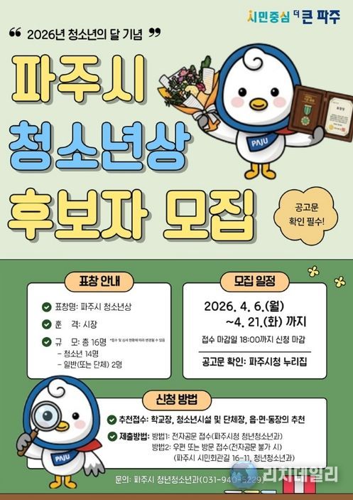 리치데일리 김상현 기자 | 파주시는 타의 모범이 되는 청소년 및 청소년지도자(또는 단체)를 선발·시상하는 ‘파주시 청소년상’후보자를 오는 4월 21일까지 추천받는다.