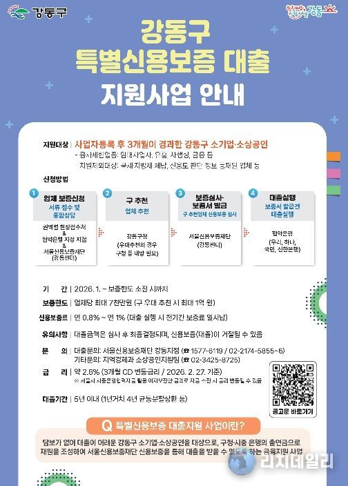 현재 현장 접수처 운영은 종료됐지만, 강동구 소상공인은 서울신용보증재단 강동종합지원센터 또는 4개 협력 은행(국민·신한·우리·하나) 관내 영업점을 통해 보증 한도 소진 시까지 특별신용보증 대출을 신청할 수 있다.