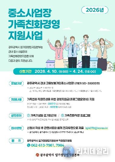 리치데일리 김상현 기자 | 광주광역시 일가정양립지원본부는 ‘2026년 가족친화경영 지원사업’에 참여할 지역 중소사업장 30곳을 오는 10일부터 24일까지 모집한다.