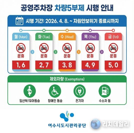 리치데일리 김상현 기자 | 여수시도시관리공단(이사장 송병구)은 최근 중동 사태로 인한 자원안보 위기 ‘경계’ 단계 발령에 따라, 오는 4월 8일부터 자원안보 위기 경보 해제 시까지 관내 공영주차장을 대상으로 ‘차량 5부제’를 민간 부문까지 확대 시행한다고 밝혔다.