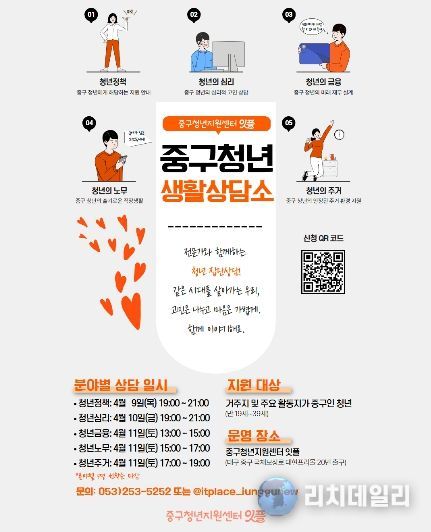 리치데일리 김상현 기자 | 대구 중구청년지원센터(센터장 김주호)는 4월 9일부터 11일까지 ‘중구 청년 생활 상담소’ 프로그램을 운영한다.