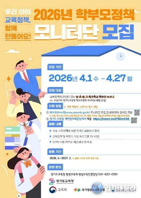리치데일리 김상현 기자 | 경기도교육청(교육감 임태희)이 현장과 함께 만드는 경기교육 정책 실현을 위한 '2026년 경기 학부모정책 모니터단’을 공개 모집한다.