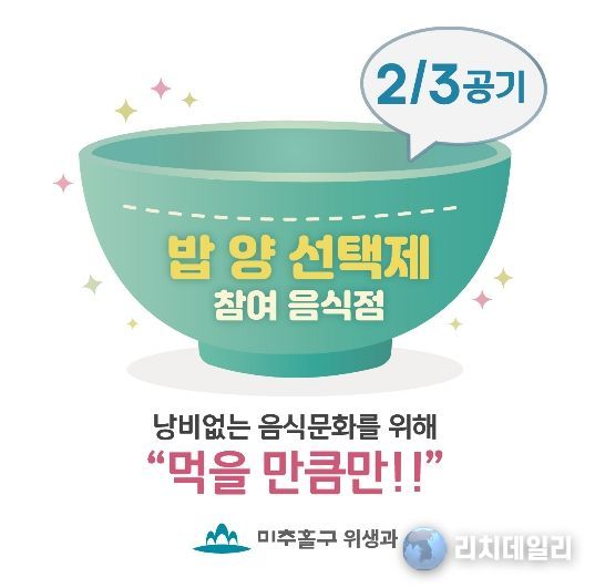 리치데일리 김상현 기자 | 인천 미추홀구보건소(소장 차남희)는 건강한 식생활 문화를 확산하고 낭비 없는 음식 문화를 조성하기 위해, 4월부터 관내 음식점을 대상으로 ‘건강한 밥양 선택제’를 시행한다고 밝혔다.