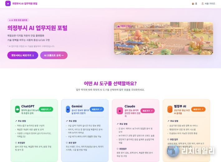 먼저 인공지능(AI) 도구 추천으로 가장 활용도가 높은 ChatGPT, Gemini, Claude와 행정안전부에서 운영 중인 범정부 AI 등 주요 서비스 바로가기를 제공해 접근성을 높였다.
