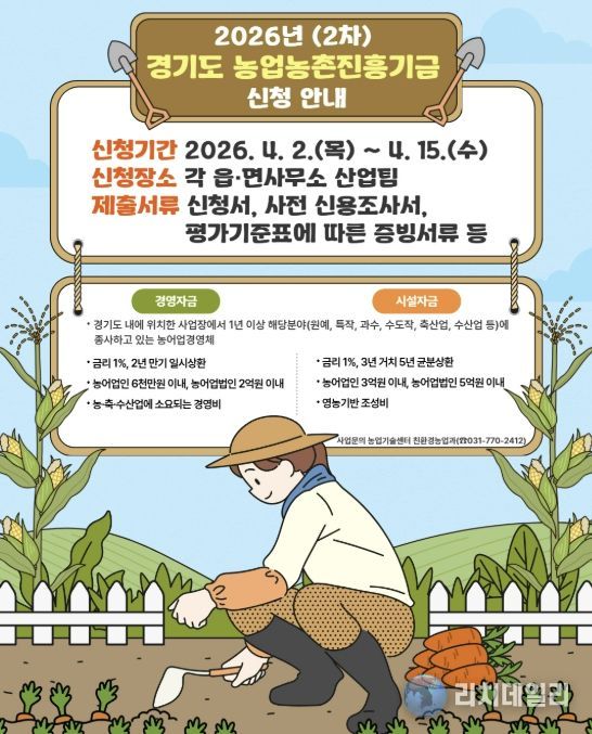 리치데일리 김상현 기자 | 양평군은 농어업인의 소득 향상과 삶의 질 개선, 경영 안정을 도모하고 농업 경쟁력 강화를 위해 ‘2026년 경기도 농업농촌진흥기금 경영 및 시설자금 지원’ 2차 대상자를 모집한다고 밝혔다.
