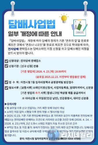 시 관계자는 “전자담배 판매업소도 담배소매인 지정 대상에 포함되는 만큼 기한 내 신청해 불이익을 받는 일이 없도록 유의해 주시기 바란다”라며 “앞으로도 제도 변경 사항을 정확히 안내해 제도가 안정적으로 정착되도록 지원하겠다”라고 말했다.