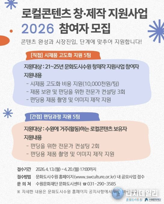 리치데일리 김상현 기자 | 수원문화재단은 오는 20일까지 지역 고유의 문화자원을 활용한 로컬콘텐츠 발굴과 창작자 육성을 위해 ‘2026 로컬콘텐츠 창·제작 지원사업’을 함께할 참여자를 모집한다.