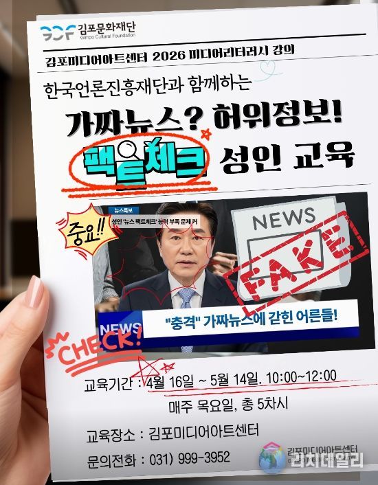 김포미디어아트센터 관계자는 “한국언론재단과 협력해 보다 전문적이고 심층적인 교육을 준비했다”며 “성인과 시니어 모두가 미디어 환경 속에서 스스로 정보를 검증할 수 있는 역량을 갖추는 계기가 되길 기대한다”고 밝혔다.