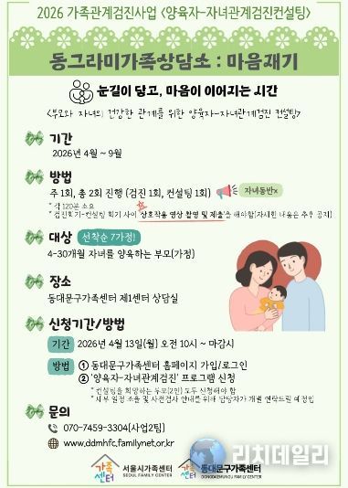 리치데일리 김상현 기자 | 서울 동대문구는 건강한 가족관계 형성과 의사소통 증진을 위해 ‘2026 가족관계검진사업’을 본격 운영한다고 밝혔다.